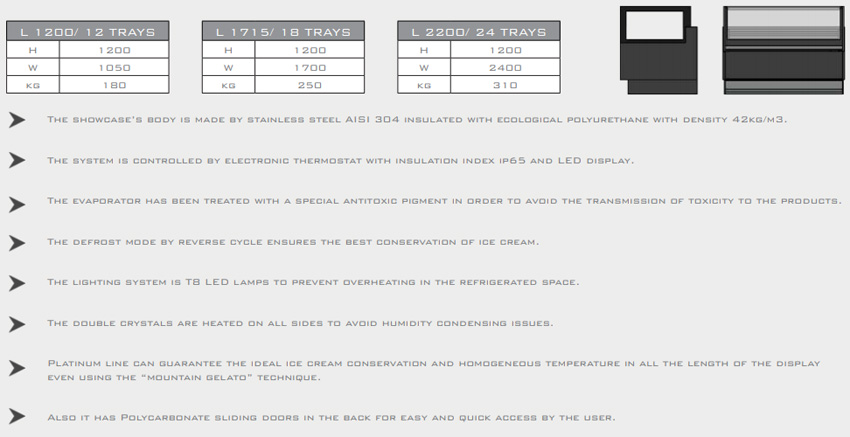 Với tủ trưng bày kem PLATINUM có các model như PLATINUM 12 khay, PLATINUM 18 khay, PLATINUM 24 khay